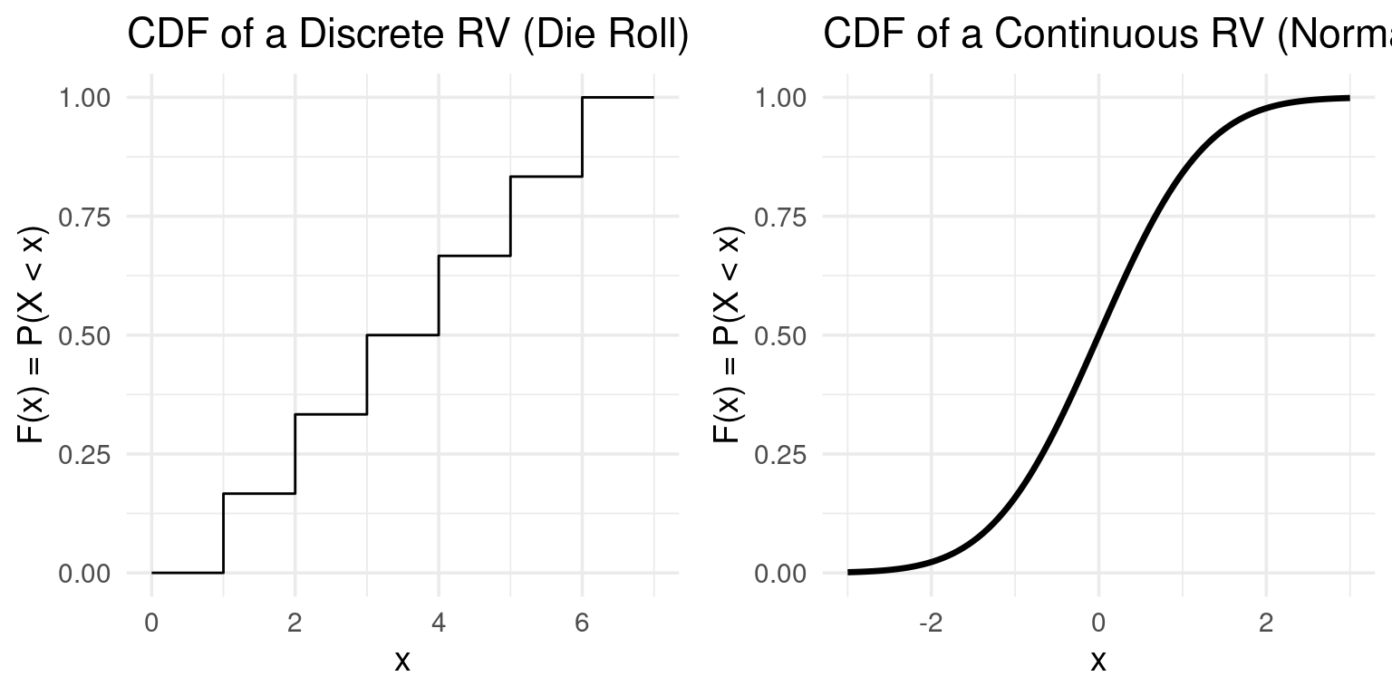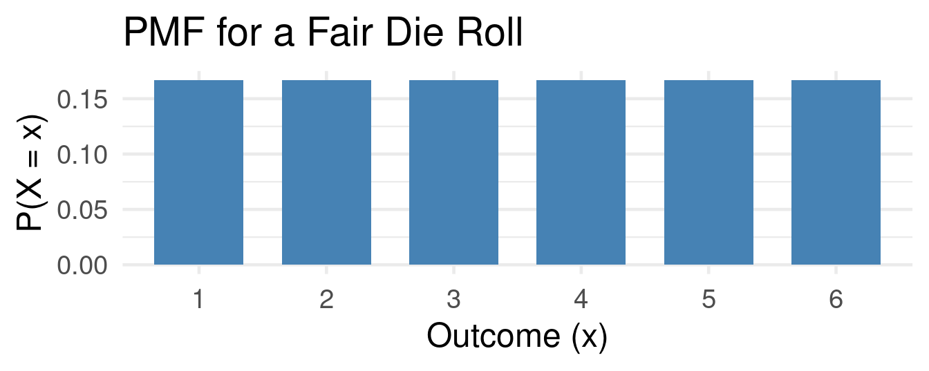 Let \(X\) be the outcome of a fair die roll. The PMF is: \(f(1) = 1/6\), \(f(2) = 1/6\), …, \(f(6) = 1/6\).