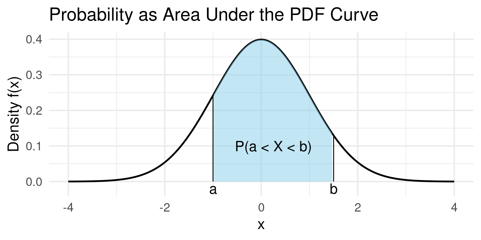 \[ P(a \leq X \leq b) = \text{ Area under $f(x)$ between $a$ and $b$} \]