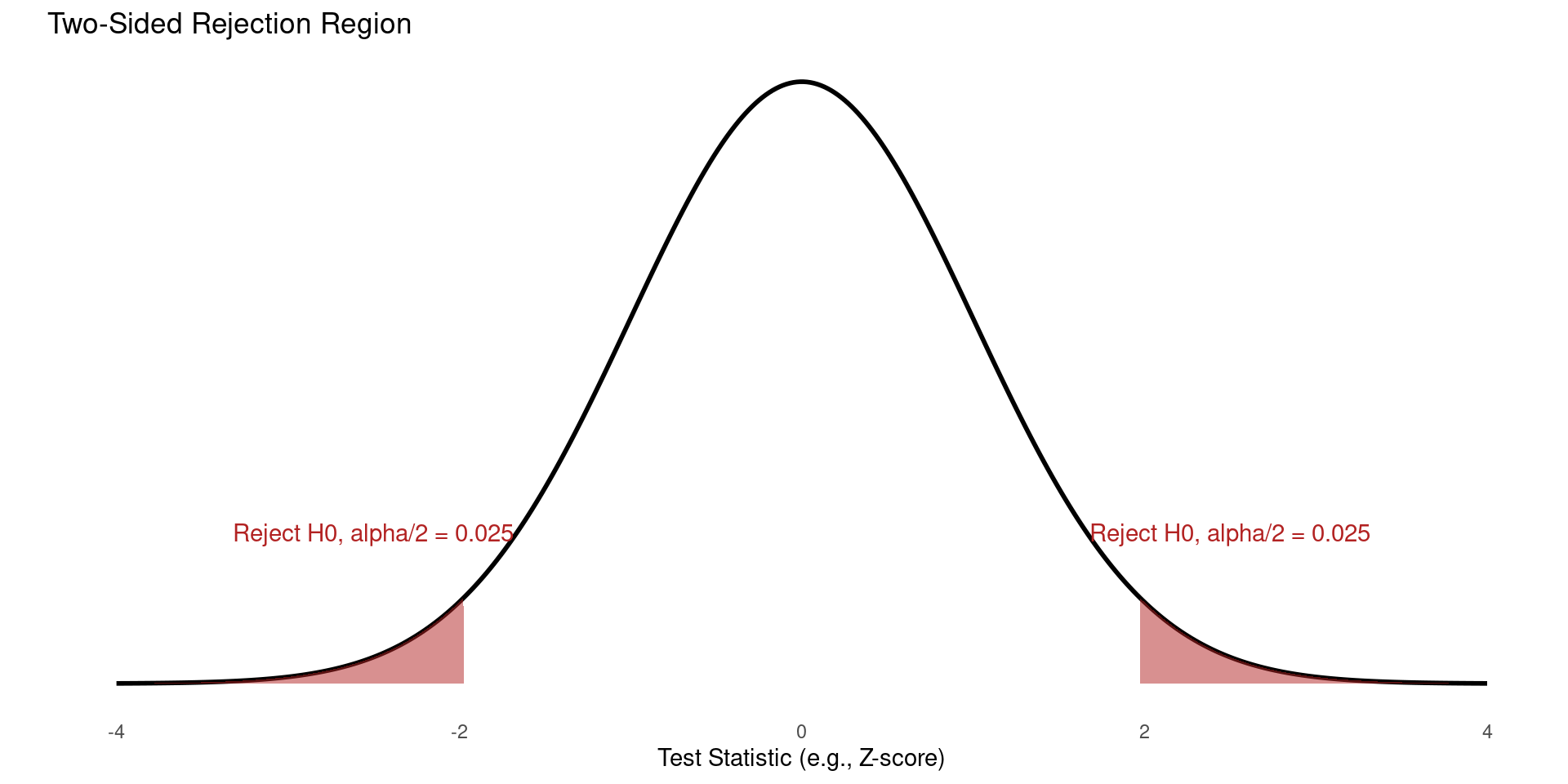 The significance level (\(\alpha\), e.g., 0.05) is split between the two tails of the distribution.
