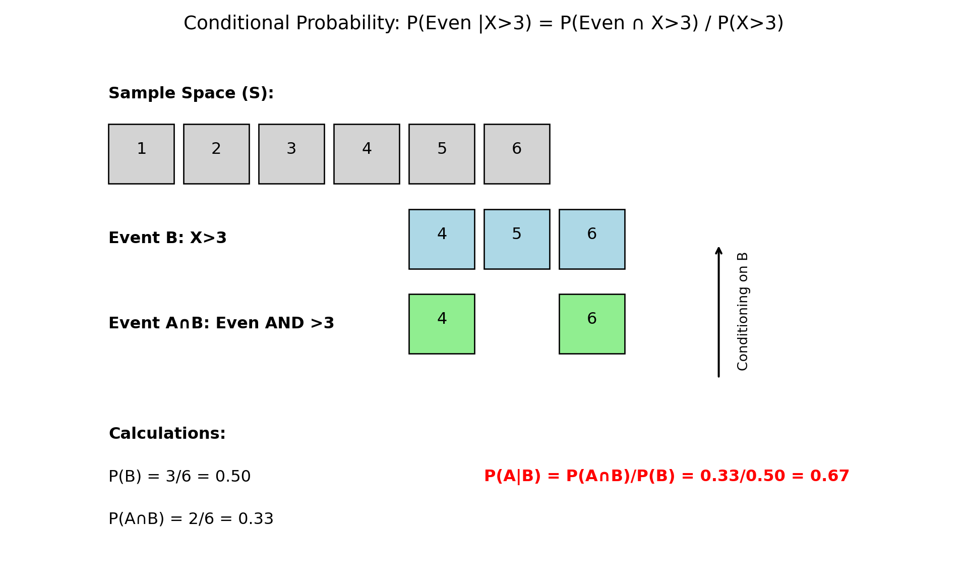 Question: What is the probability that the number is even, given that we know it is greater than 3? We want to find \(P(A|B)\).