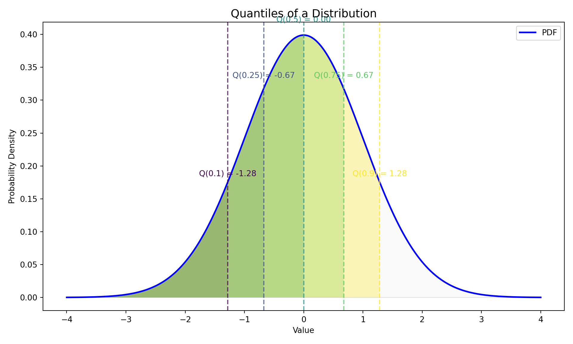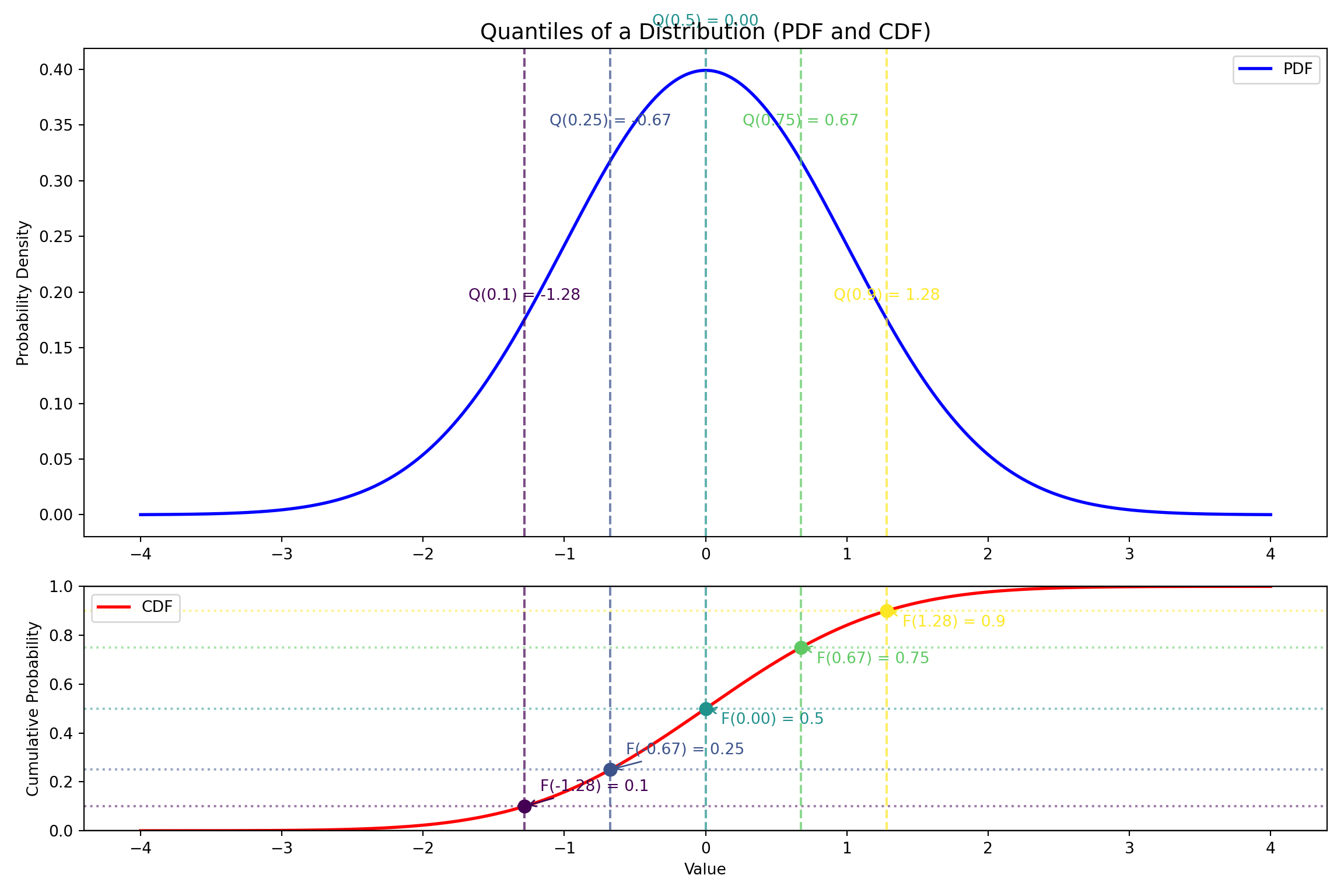 \[ P(X \leq Q(\tau)) = F(Q(\tau)) = \tau \] This means the quantile function, \(Q(\tau)\), is the inverse of the CDF: \(Q(\tau)=F^{-1}(\tau)\)