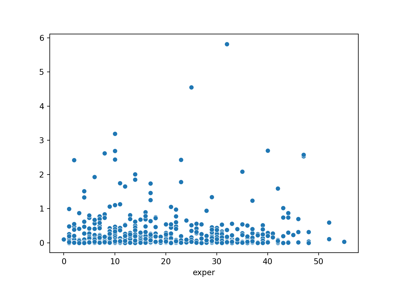 Create a scatter plot with the values of exper on the x-axis and the squared residuals on the y-axis.