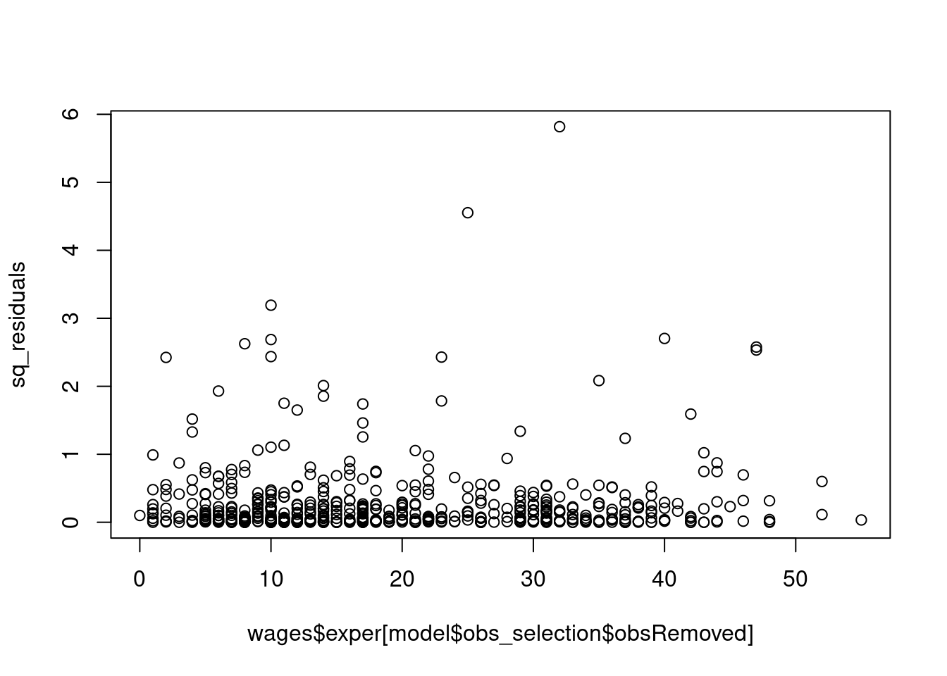 library(ggplot2)# 1. After estimating the OLS model, obtain the residuals.^[In R, you can use the `model$residuals`. In Python, it's `model.resid()`. In Stata, it's `predict res, residuals`. ]sq_residuals <- model$residuals^2# 2. Create a scatter plot with the values of `educ` on the x-axis and the squared residuals on the y-axis.plot(x=wages$exper[model$obs_selection$obsRemoved], y=sq_residuals)