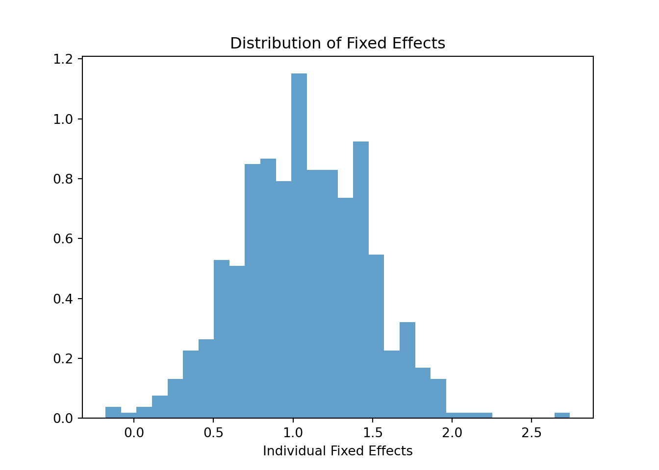 The histogram shows a wide spread of fixed effects, suggesting substantial unobserved time-constant heterogeneity across individuals. Since these effects capture persistent individual differences not explained by the predictors, their significant variation implies that individual-specific factors play an important role in wage determination. The roughly bell-shaped but somewhat skewed distribution indicates most individuals cluster around the mean effect, with some outliers showing particularly high or low baseline wages.