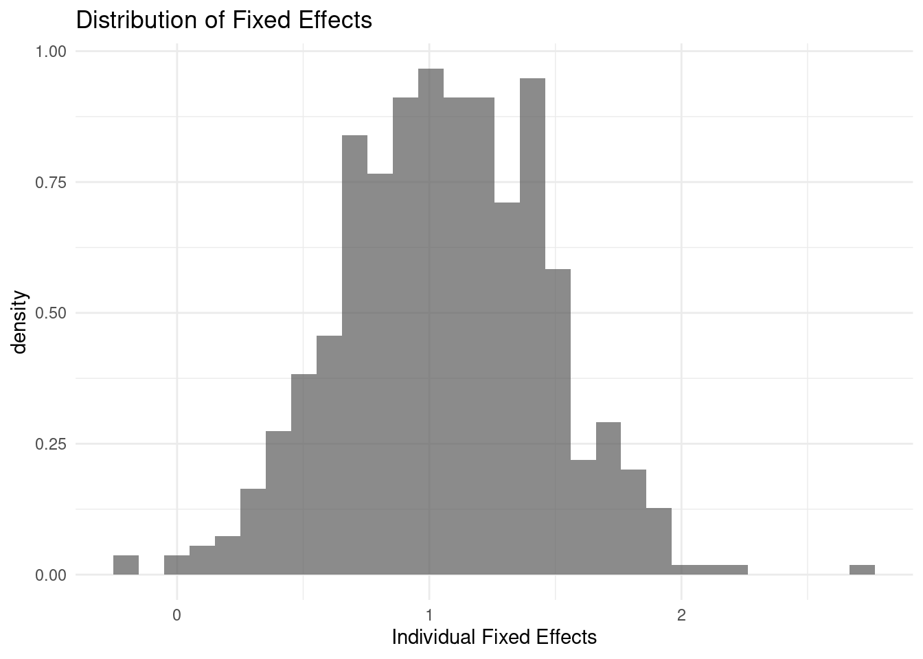 The “fixed effects” (\(\alpha_i\)) estimated in an FE model represent the time-invariant, unobserved characteristics of each individual (e.g., innate ability, motivation, family background) that affect their wage. Visualizing the distribution of these effects can reveal the extent of this heterogeneity.