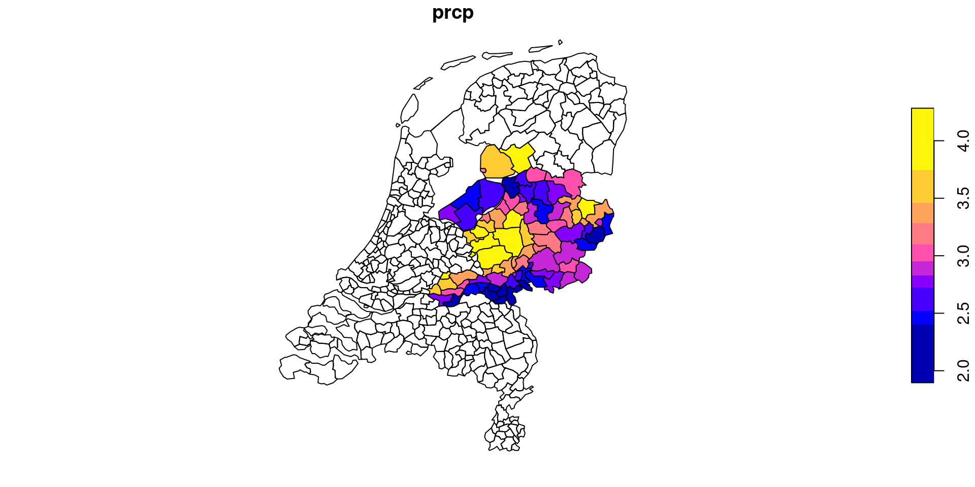 # Put it back in raster dataframepolygons_gemeenten$precipitation <- result$prcp