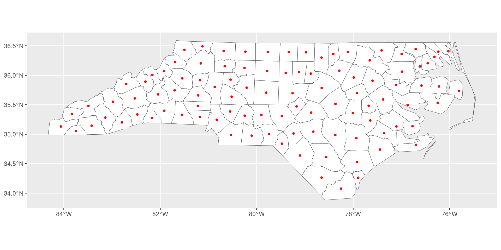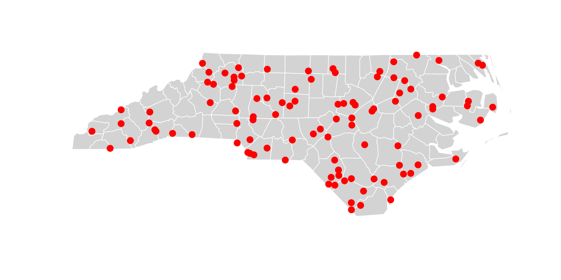 library(sf)library(dplyr)# Built-in NC counties (polygons)nc <-st_read(system.file("shape/nc.shp", package ="sf"), quiet =TRUE)# Simulate retail stores as county centroidsstores <-st_sample(st_union(nc), size=nrow(nc)) |>st_as_sf(coords="x") |>mutate(store_id =1:nrow(nc), revenue =runif(nrow(nc), 50, 200))plot(st_geometry(nc), col ="lightgray", border ="white")plot(stores, add =TRUE, col ="red", pch =19, cex =1.5)