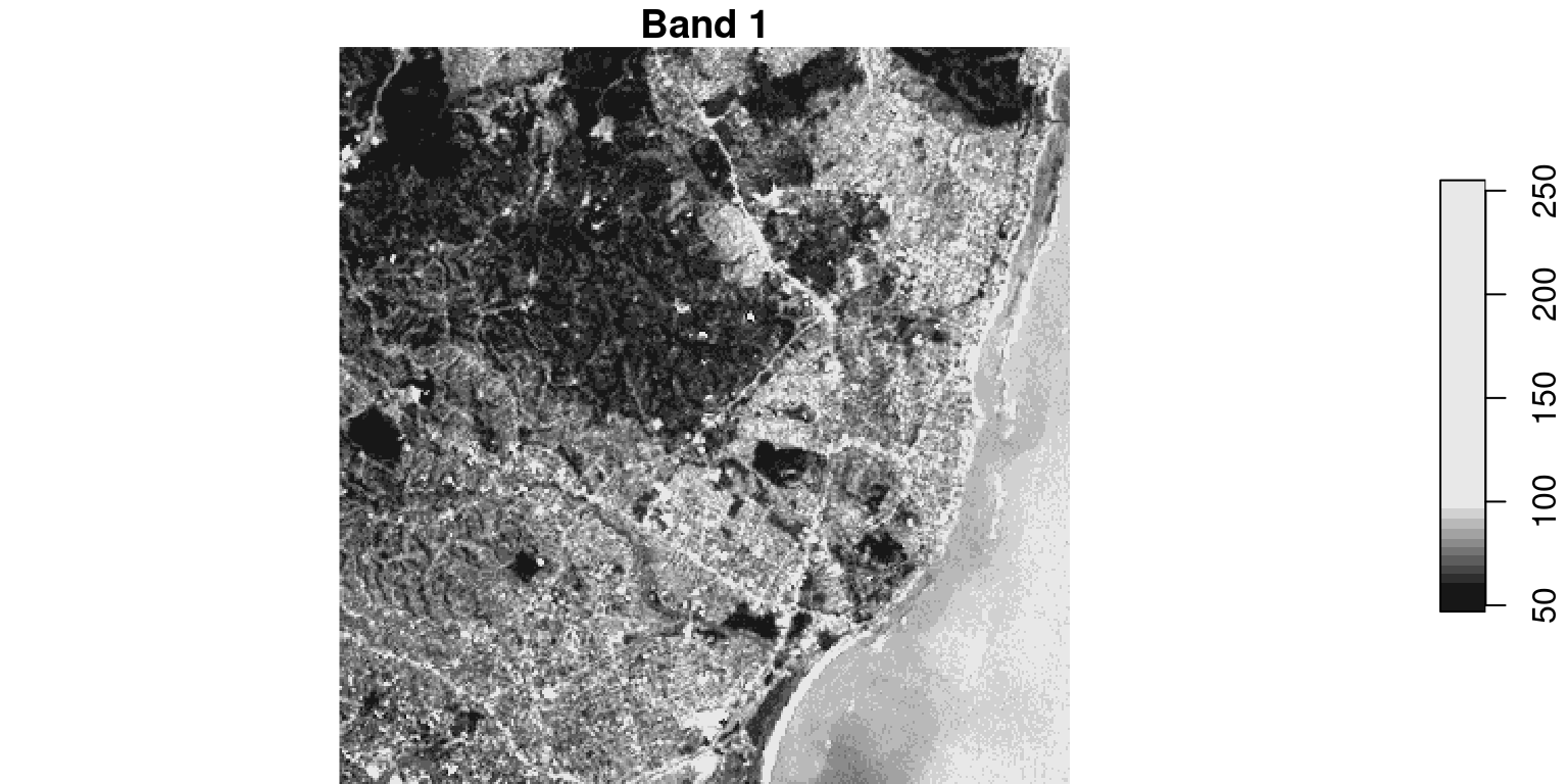 # Plot a single band# Select all attributes, x and y coordinates, and 1st bandplot(landsat[,,,1], main ="Band 1")