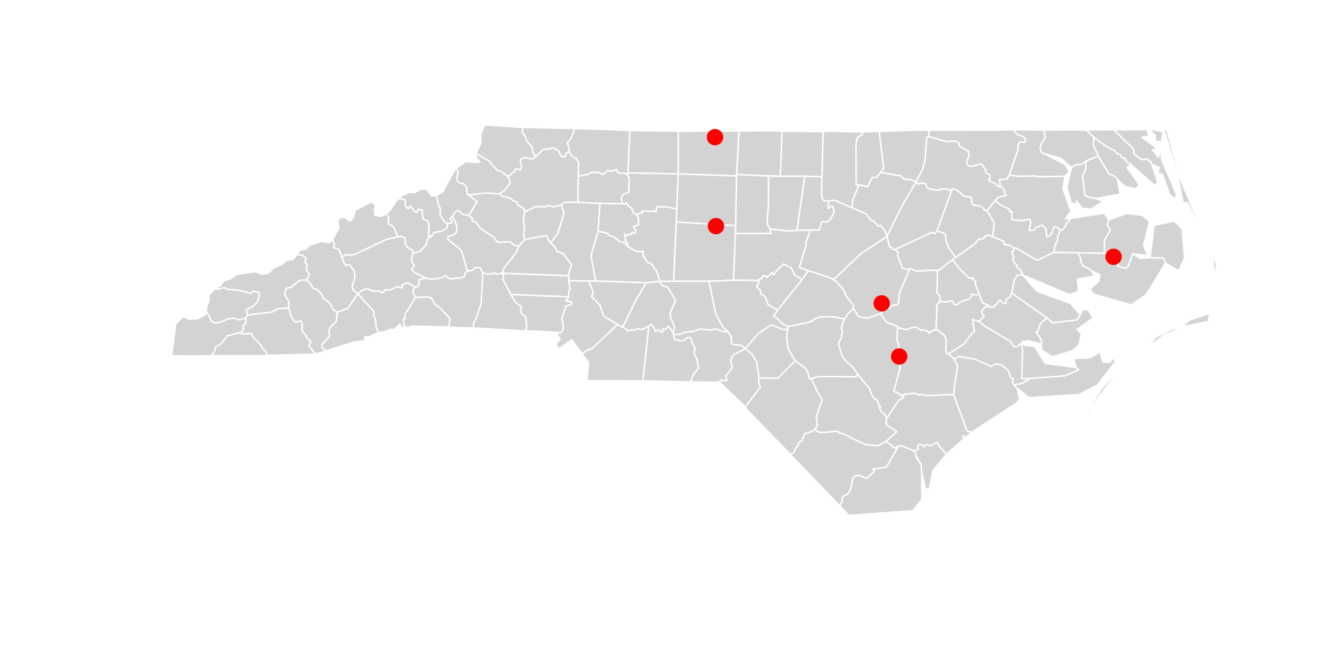 # Create 5 random points over the NC areafirms <-st_sample(nc, 5) |>st_as_sf()plot(st_geometry(nc), col ="lightgray", border ="white")plot(firms, add =TRUE, col ="red", pch =19, cex =1.5)