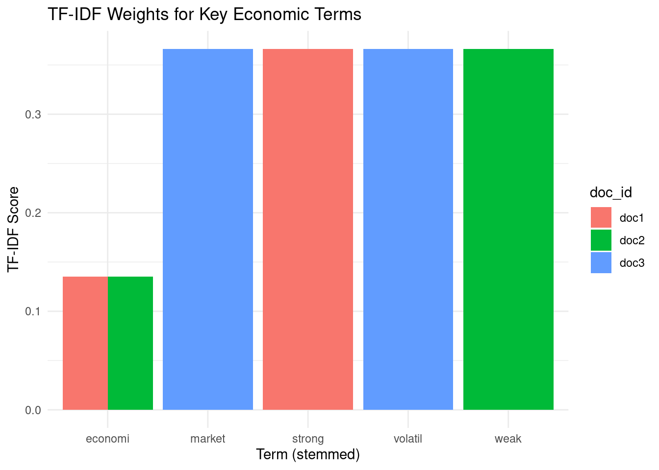 library(tidytext)library(dplyr)library(tm)# Create three sample economic documentsdocuments <-data.frame(doc_id =c("doc1", "doc2", "doc3"),text =c("The economy is strong and growing","The economy is weak and contracting","The market is volatile and unpredictable" ))# Step 1: Tokenize using tidytexttokenized <- documents |>unnest_tokens(output = word, input = text)# Step 2: Count word occurrences per documentword_counts <- tokenized |>count(doc_id, word, sort =TRUE)# Step 3: Convert to document-term matrixdtm <-cast_dtm(word_counts, document = doc_id, term = word, value = n)# Step 4: Inspect the matrixprint("Document-Term Matrix (sparse format):")