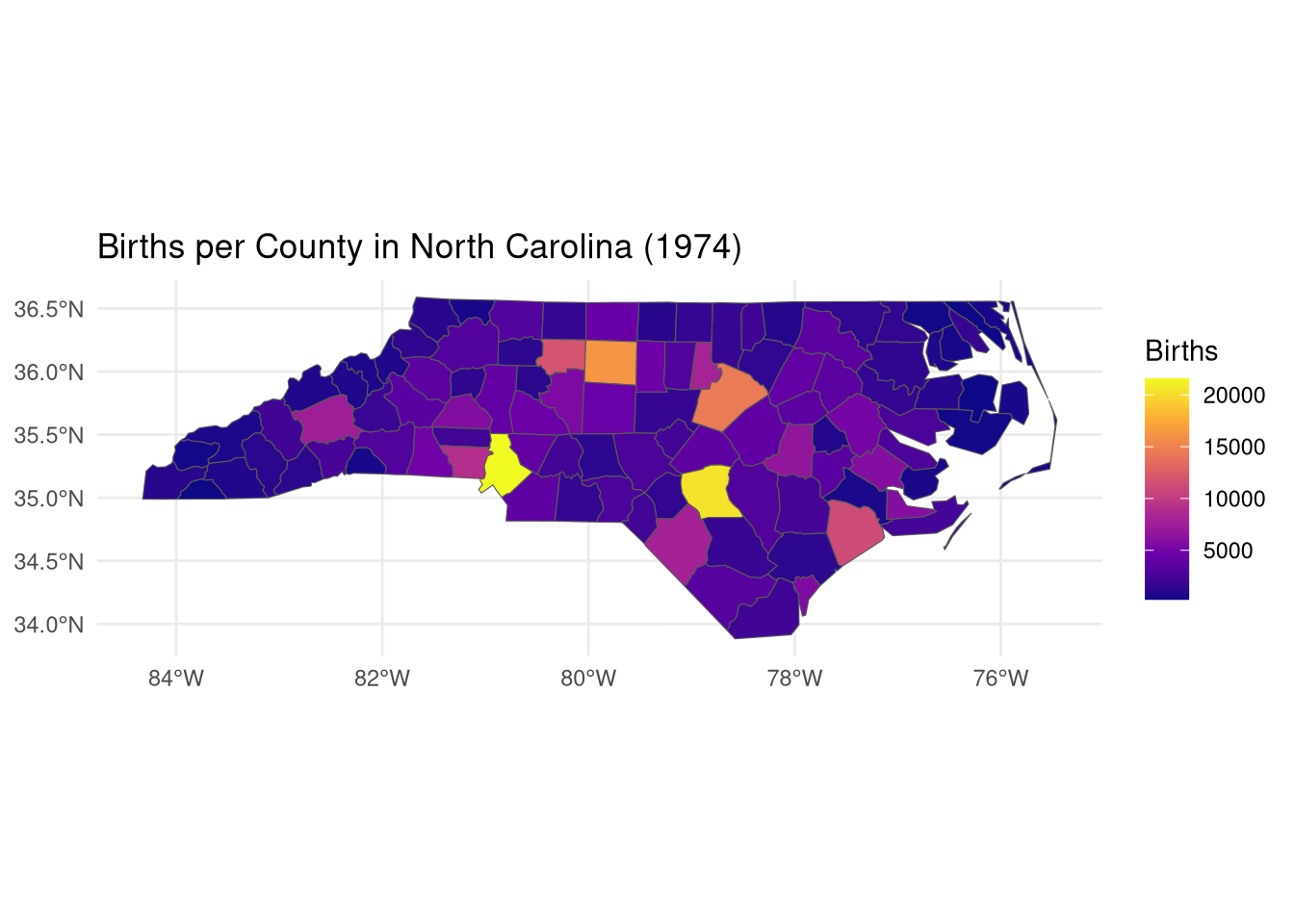 # Visualize births in 1974ggplot(nc) +geom_sf(aes(fill = BIR74)) +scale_fill_viridis_c(option ="plasma", name ="Births") +theme_minimal() +labs(title ="Births per County in North Carolina (1974)")