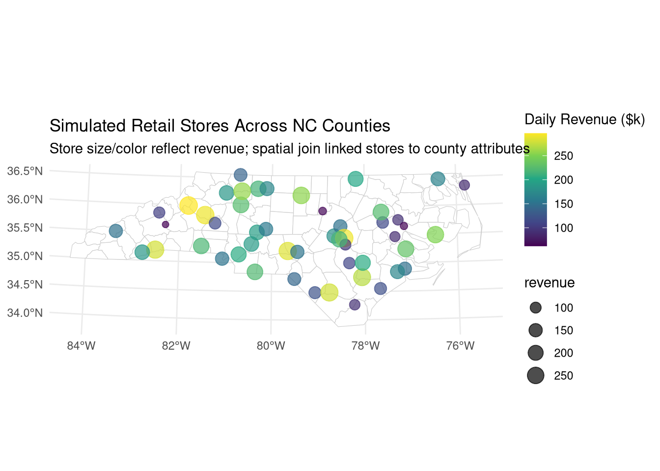 # Visualize relationshipggplot(stores_with_county) +geom_sf(data = nc_proj, fill ="white", color ="gray80") +geom_sf(aes(color = revenue, size = revenue), alpha =0.7) +scale_color_viridis_c(name ="Daily Revenue ($k)") +scale_size_continuous(range =c(2, 6)) +labs(title ="Simulated Retail Stores Across NC Counties",subtitle ="Store size/color reflect revenue; spatial join linked stores to county attributes") +theme_minimal()